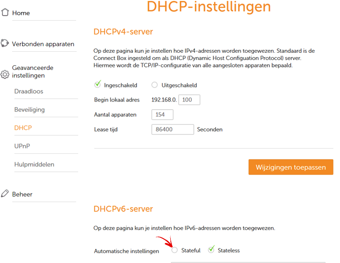 4. Vink bij automatische instellingen onder 'DHCPv6 Server' Stateful aan