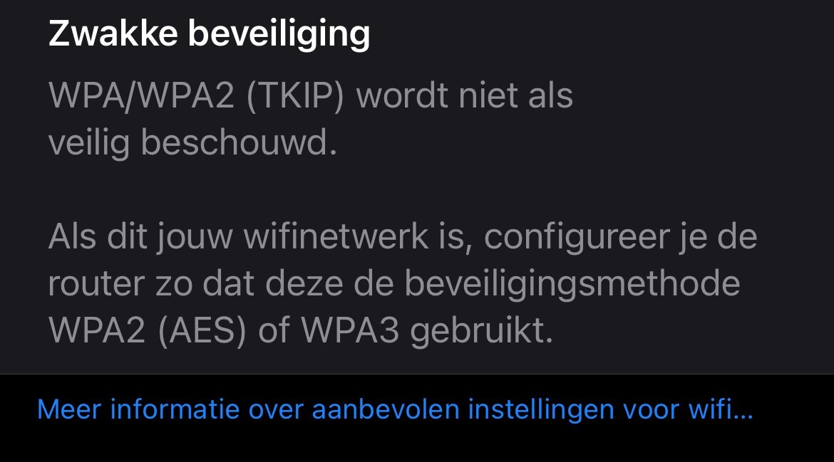Maak je gebruik van een apparaat van TP-Link? Controleer of je TP-Link een firmware-update klaar heeft staan. Er is onlangs een update verschenen op iOS die een andere standaard hanteert. Dat is de reden dat je mogelijk tegen een melding aanloopt dat de verbinding daar nog niet aan voldoet. Je verbinding is nog steeds veilig.**