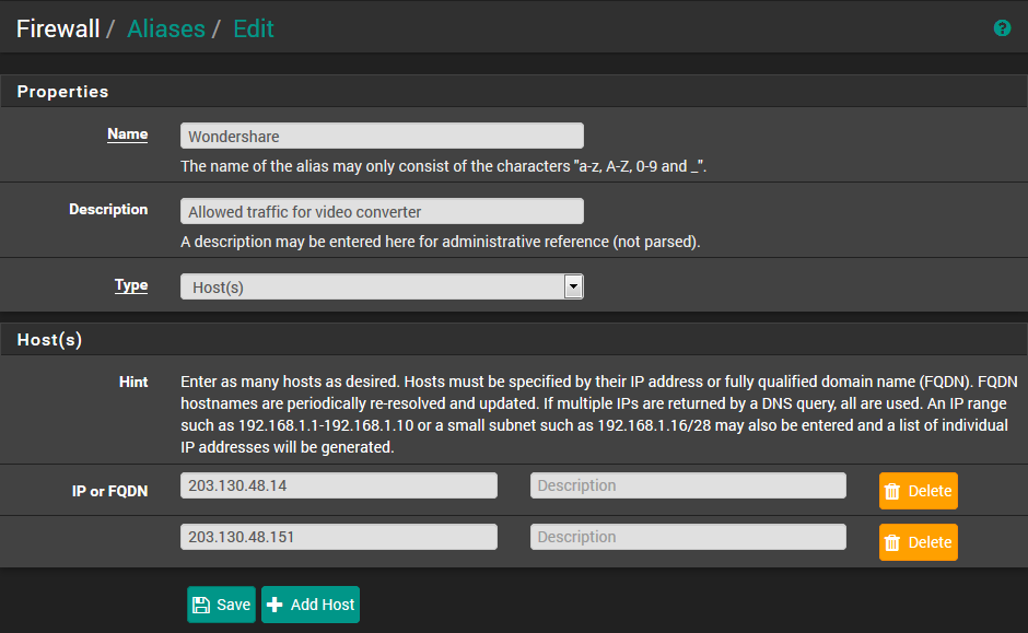 Een goede kans dat ze beide door het bedrijf gebruikt worden. Omdat ik twee IP adressen heb die ik moet toelaten, maak ik een alias aan met de beide IP adressen en geef het een duidelijke naam.