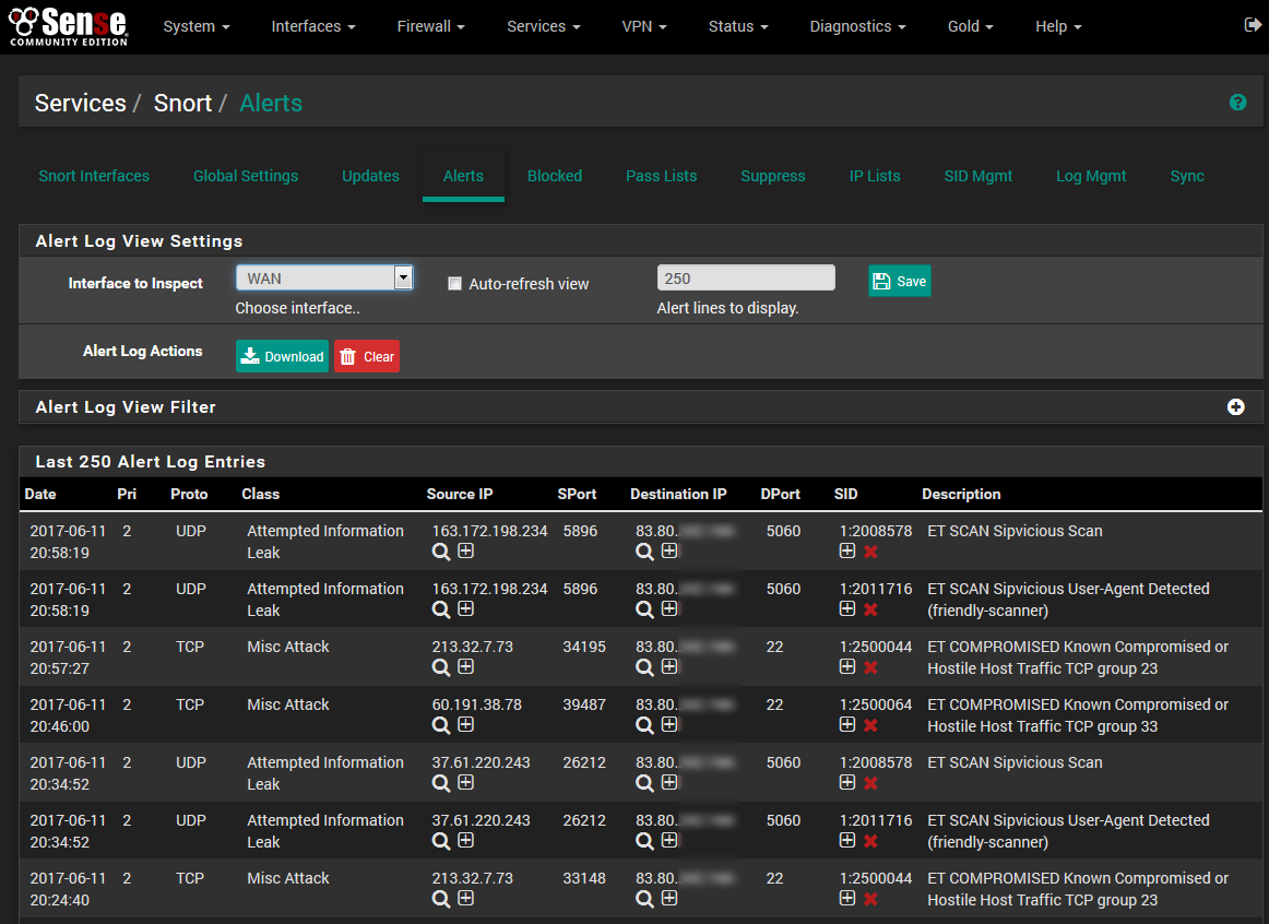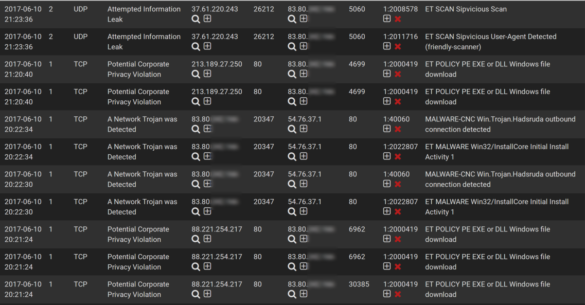 Bij mij staat hij vol met ET SCAN en ET COMPROMIZED die kijken of er bij mij poorten open staan. Het zijn vooral bekende poorten 22 (SSH) en 5060 (SIP). Als je het modem niet in bridge mode hebt staan, vangt de firewall in het modem dit voor je af.