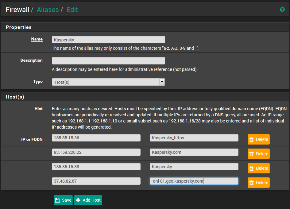 Ook is er een kans dat de antivirus updates van een andere server komen dan hun webshop. Ik ga dus een ‘alias’ aanmaken, waarin ik meerdere IP adressen kan plaatsen. Als ik even google vind ik dat kaspersky meerdere update servers heeft.