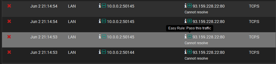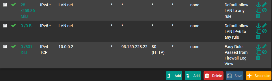 Ik kan nu een rule maken in pfSense die dit ip adres doorlaat. De eenvoudigste manier is gebruik te maken van een “easy rule”. Door op het + teken bij het IP adres te clicken, kan pfSense een zelf rule aanmaken om dit IP adres door te laten.pfSense heeft zelf een pass rule aangemaakt