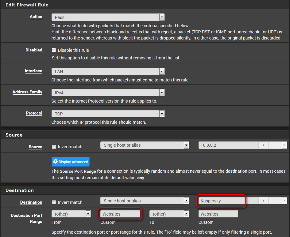 Met deze twee alias lijsten ga ik de easy rule aanpassen zodat die alles voor Kaspersky doorlaat