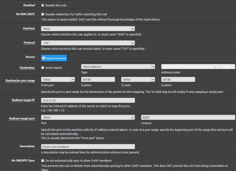 Redirect target IP Dit is het IP nummer aan de LAN zijde waar het binnenkomende verkeer naar toe wordt geleidt. Ik kies voor 10.0.0.101. Hierop zit een raspberry pi met Domiticz.
