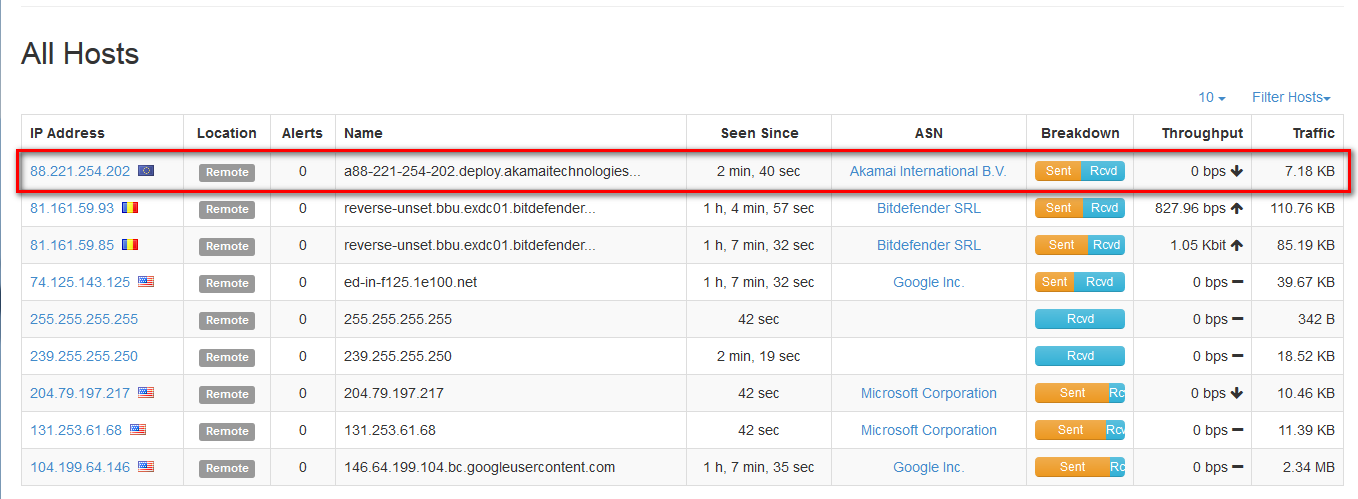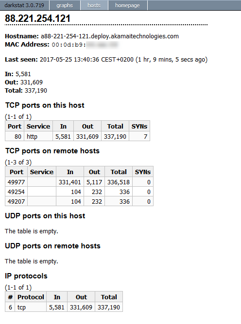 Dit zijn dus niet alleen actieve verbindingen. De laatste kolom geeft aan wanneer er voor het laatst gecommuniceerd is. De data In/Out is in bytes. Op deze manier is snel te zien wanneer er veel data naar/van een bepaalde host gaat. Om meer informatie over een bepaalde host te krijgen kun je op het IP adres clicken.Darkstat details Akamai host