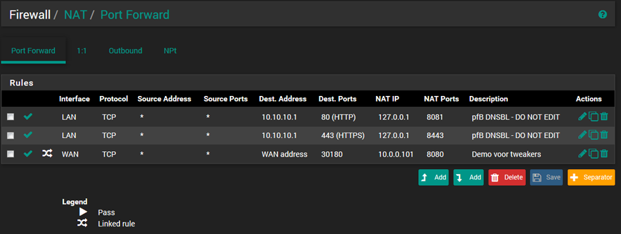 Ik behandel hier even (IPv4) port forwarding voor de pfSense firewall. Dit is te vinden onder firewall> NAT