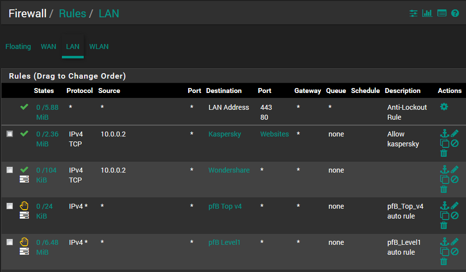Het enige probleem is dat de ‘pass’ rule onderaan staat, terwijl de ‘block’ rule bovenaan. Alle rules worden van boven naar onder afgewerkt, en zodra hij een ‘block’ rule tegenkomt die geldig is, worden de andere rules niet meer bekeken. Gelukkig heeft pfSense een eenvoudig mechanisme om een rule te verplaatsen: Selecteer de rule met de checkbox, en click op het anker icoon van de rule waar hij boven moet. Voorlopig kies ik ervoor om hem bovenaan te plaatsen.