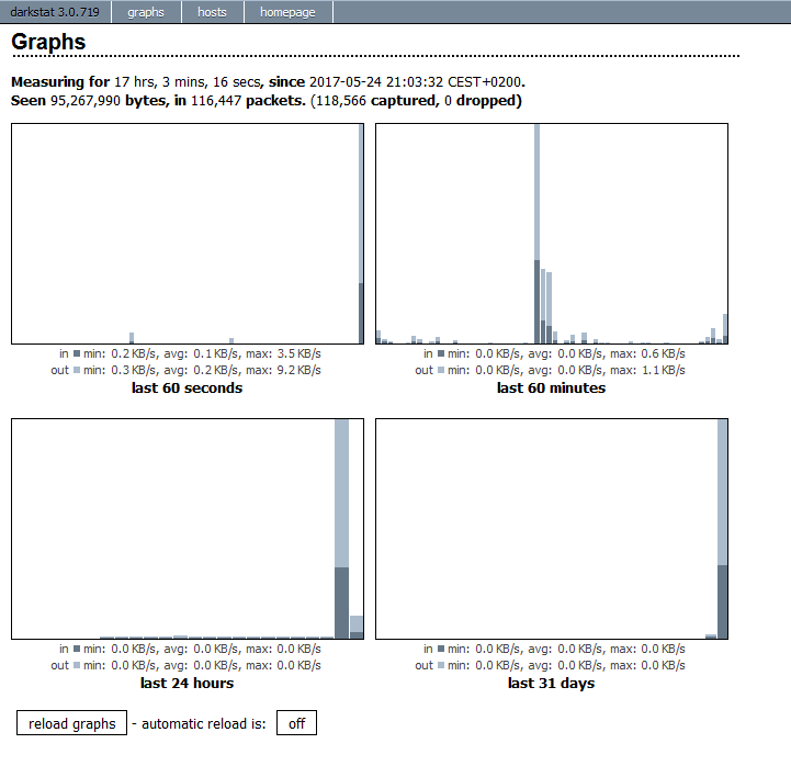 Darkstat zelf geeft allereerst een grafische weergave van de hoeveelheid verkeer in de afgelopen 60 seconden, 60 minuten, 24 uur en 31 dagen. Bij mij zijn ze jammer genoeg een beetje leeg, omdat ik heb gespeeld met de opties en de poorten waarop hij meet. Hierbij ben ik alle data van de afgelopen maand kwijt geraakt.