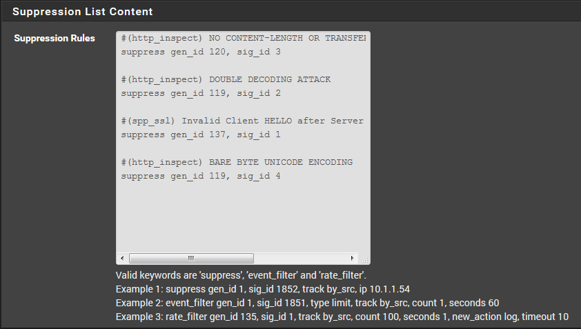 Hierboven is een voorbeeld van een gegenereerde suppress lijst, die dus bepaalde regels onderdrukt. Het lijkt moeilijk te lezen, maar dat hoeft ook niet. Er is nog net te lezen welke rule onderdrukt wordt. Bij de onderste stond mijn lokale IP adres, die heb ik weggehaald om het voor alle IP adressen te laten gelden (het is gewoon een tekst bestandje)