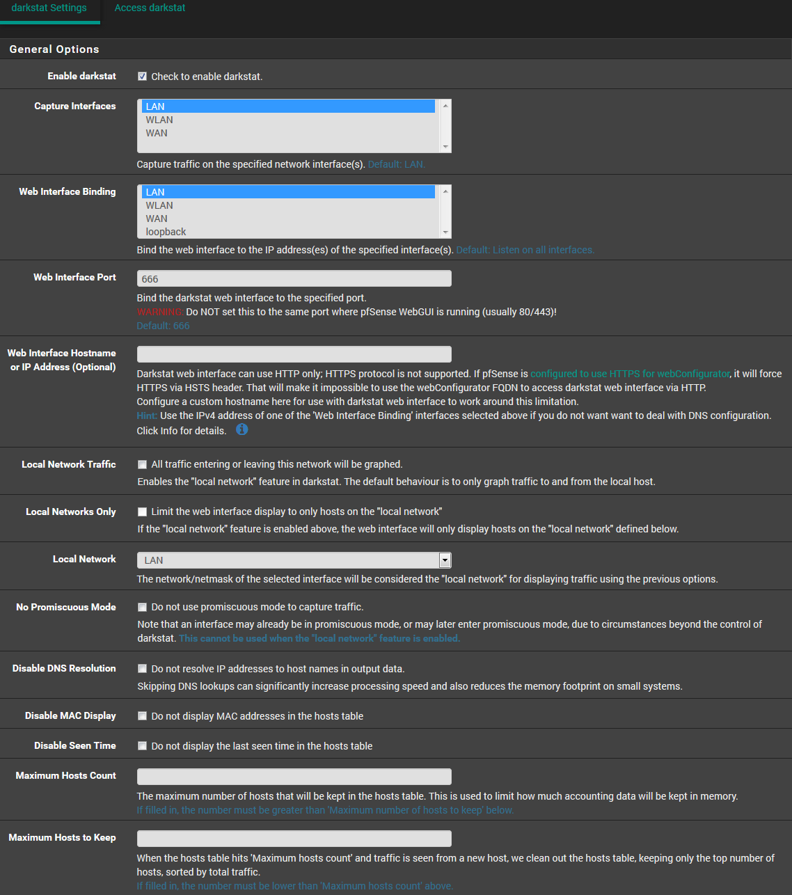 Als eerste zijn de Capture interfaces in te stellen. Dit zijn dus de netwerk interfaces waarop darkstat luistert naar verkeer. Standaard staat het ingesteld op LAN. Ik vond dat een beetje vreemd, omdat je dan ook al het interne verkeer ziet, tenminste voor zover het aankomt bij pfSense. Voordeel is wel dat je niet alle port scans als data verkeer ziet. Het is me namelijk niet helemaal duidelijk of hij voor of na de firewall filters meet. Als je wilt kun meerdere interfaces selecteren waarop geluisterd wordt. Dat is ook wat gedaan wordt op andere darkstat configuraties (buiten pfSense) die ik vond.
