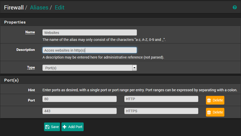 Omdat ik zowel http (poort 80) als https (poort 443) moet toestaan, ga ik ook een alias maken voor de poorten