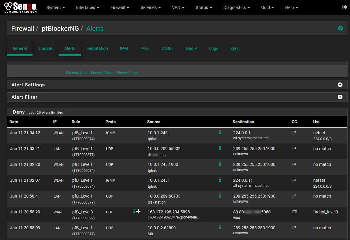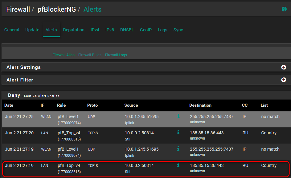 Het ping commando geeft een ip adres, en dat is precies wat we nodig hebben. In dit geval wordt de website geblokkeerd, maar de ping vanaf pfSense zelf doorgelaten. Ik ga eens kijken of ik de geblokkeerde website terug kan vinden in de alerts van pfSense.Het IP adres (93.159.228.22) is terug te vinden in de alert lijst