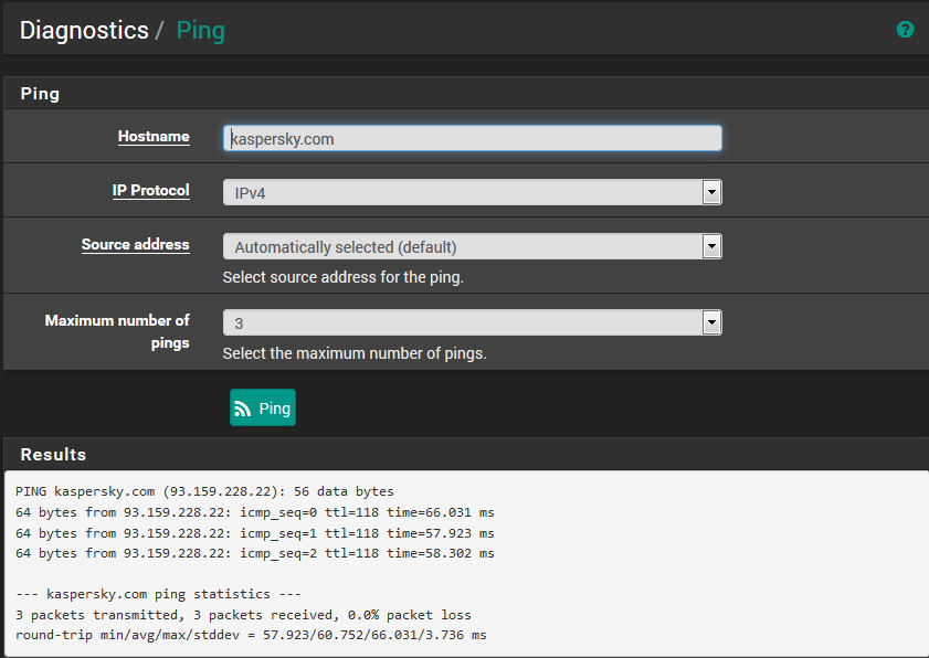 De foutmelding geeft al aan dat de server niet te bereiken is. Het is dus niet zo dat de DNS server weigert de domeinnaam om te zetten. Ik kan dit controleren in een cmd window met het ping commando. Ik krijg misschien geen antwoord van de server, maar de naam van de website wordt wel omgezet in een IP adres. Wie een cmd window te onwennig vindt, ook vanuit pfSense kun je een ping uitvoeren.Ping vanuit pfSense: De naam wordt nog omgezet naar een IP adres