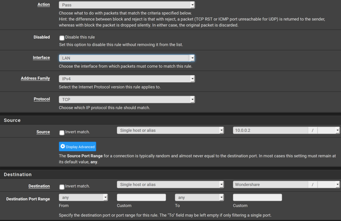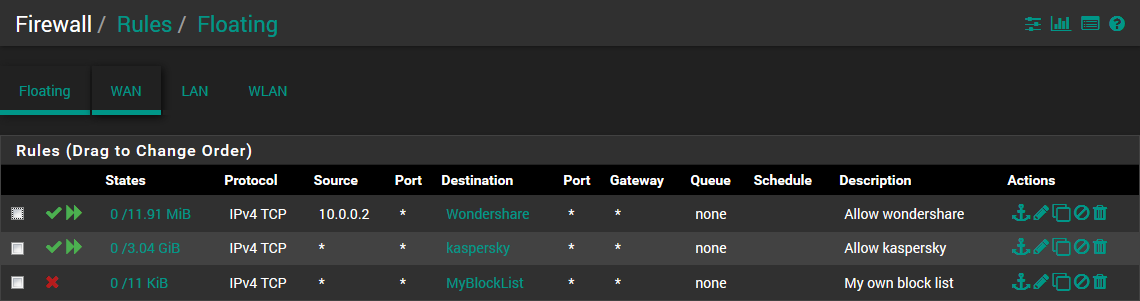 Hier is veel onduidelijkheid over, en eerlijk gezegd is het mij zelf ook lange tijd onduidelijk geweest. PfSense laat je namelijk ook rules aanmaken die niet zullen werken, zoals aan de WAN zijde een filter met source=10.0.0.5 en destination=facebook. (Dit werkt niet want de WAN zijde heeft geen inkomend verkeer van 10.0.0.5).