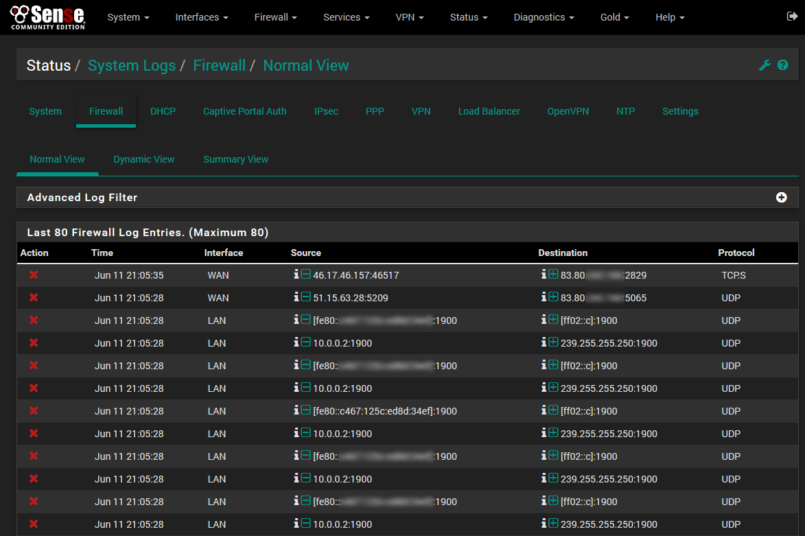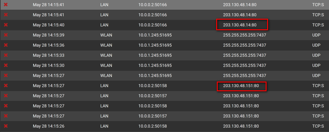 Ik blokkeer in pfSense een aantal websites, gebaseerd op de URL’s en op IP adressen. Anderen hebben daarbij de lijsten samengesteld. Ook blokkeer ik hele landen, omdat van daaruit relatief veel hackpogingen worden gedaan. Soms blokkeer ik daarmee teveel. Software wil ineens niet meer updaten, of de online verificatie mislukt. In dat geval moet je overwegen of je een uitzondering wilt maken.
