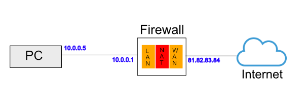 Als ik vanaf de PC een datapakketje naar een website verstuur (b.v. een PING of een click op een link), dan gaat dat datapakketje van de PC naar de firewall, en die stuurt het naar de website.