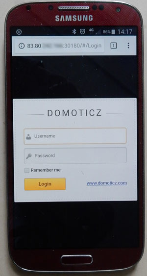 Als het goed is, verschijnt dan het Domiticz login scherm op mijn telefoon.