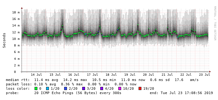 Ziggo in mijn buurt, de ping schommelt altijd tussen de 8 en 20ms (12ms jitter), en elke avond neigt het meer naar 20ms.