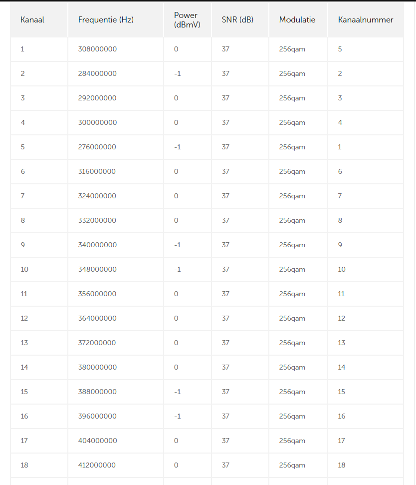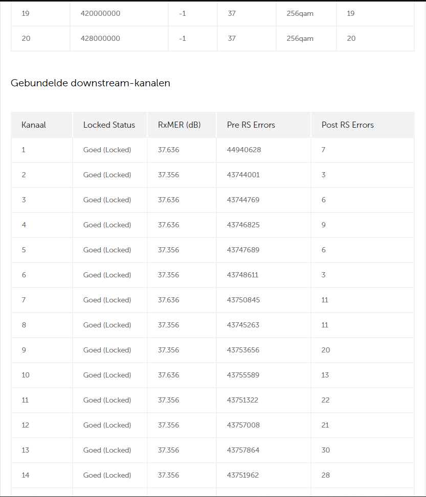 De waarden in uw modem zien er normaal uit. Kunt u die ook nog eens controleren op het moment dat u de storing ervaart? Overigens begrijp ik uw opmerking niet over de mediabox als u geen abonnement op digitale tv heeft. Maar u heeft gelijk dat het opnemen van de mediabox XL in het thuisnetwerk voor problemen kan zorgen.