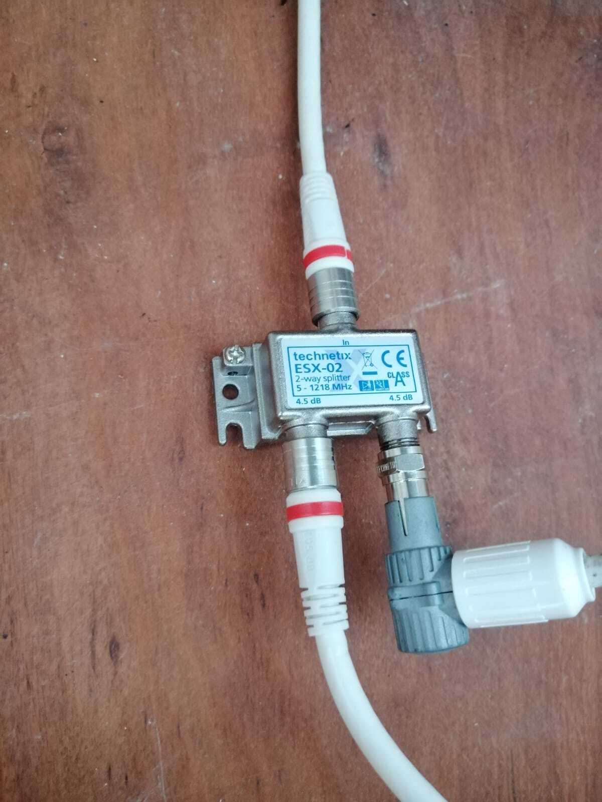 Fijn dat je er naar kunt kijken. Zie onderstaande foto's voor de aansluitingen. Ik heb het ook zonder two-way splitter geprobeerd (dus alleen het modem aansluiten) en ook nog met een amplifier, maar niets werkt. De televisie werkt inderdaad ook niet.