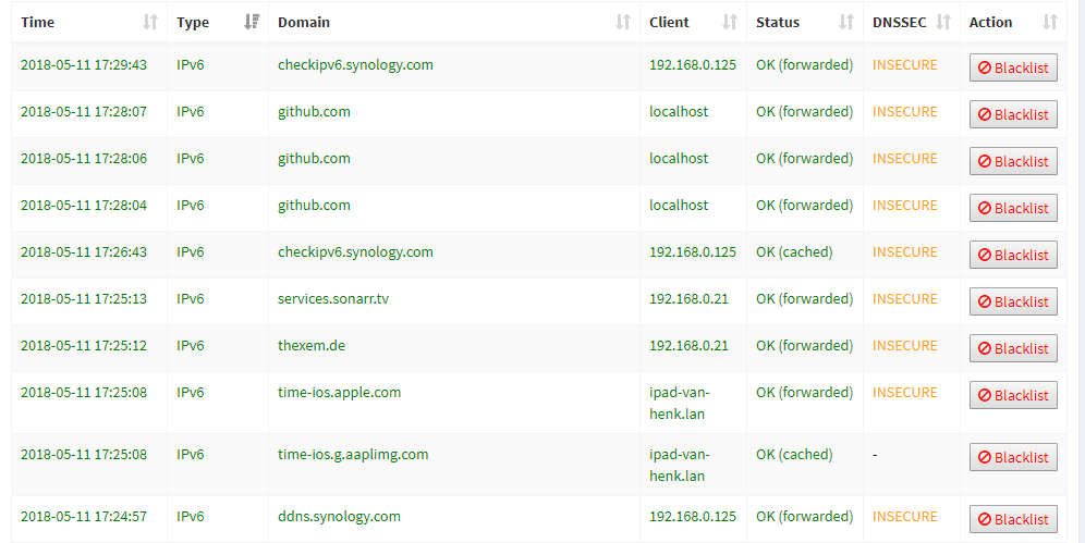 Heb even goed in de logs gekeken. Mijn hue doet het wel op ipv6, alleen mijn iphone en laptop niet. Ik kan op mijn iphone wel manual de ipv6 dns'en uit de lijst halen zodat het ipv4 dns wordt gebruikt, en dan zie ik in de pihole logs mijn iphone voorbij komen, alleen laad dan de website niet (denk dat de dns niet resolved). Ik zie echter dat bij jou je ipad bijvoorbeeld wel gewoon werkt.