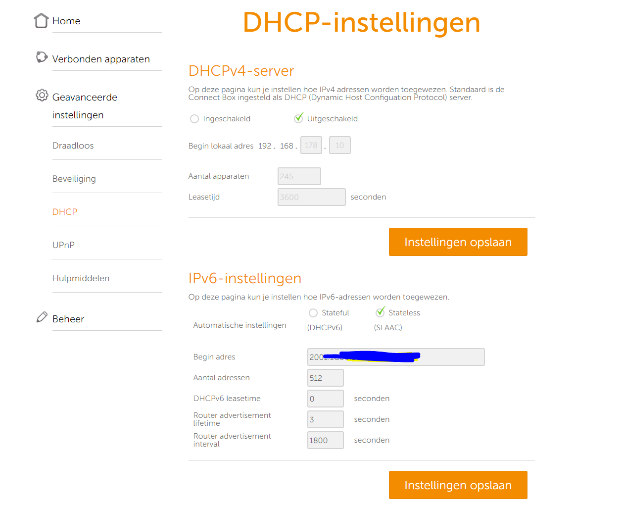 Door in je Arris -CB DHCP-4 uit te schakelen, schakel je uitsluitend je eigen interne IPV4 thuisnetwerk uit, maar niet IPV6.