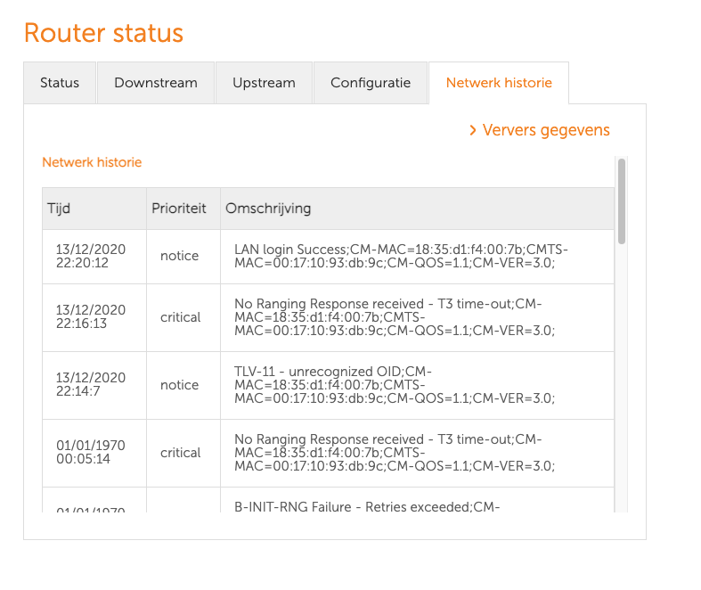 What I see in my router logs are many of "No Ranging Response received - T3" entries. So looks like same problem with https://community.ziggo.nl/community-archief-226/many-no-ranging-response-received-t3-time-out-error...