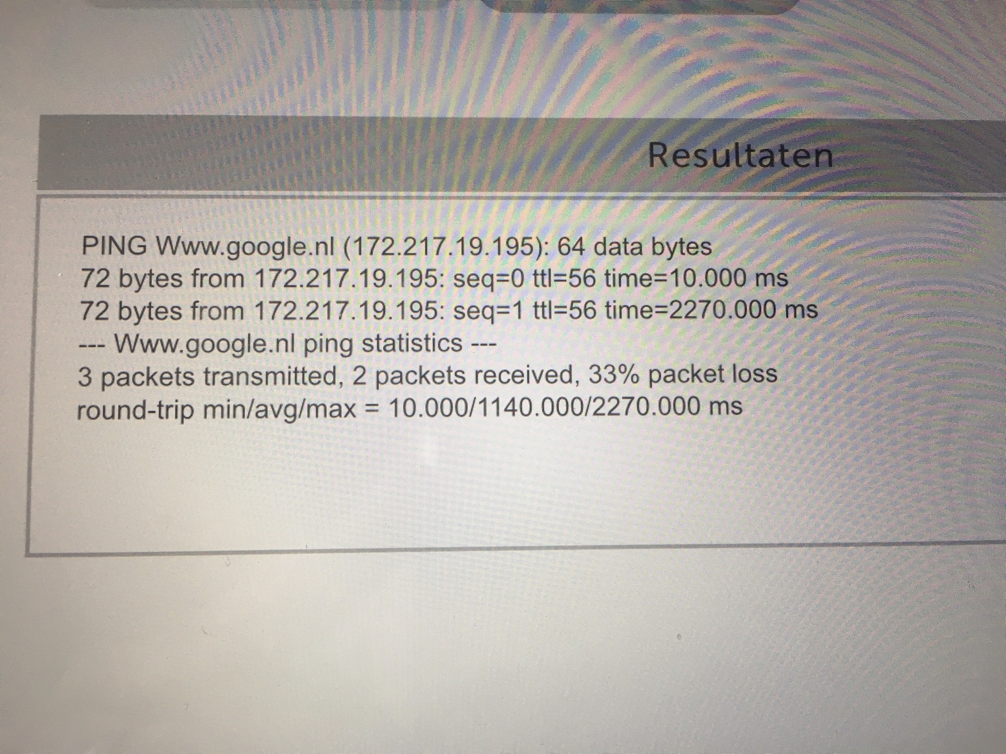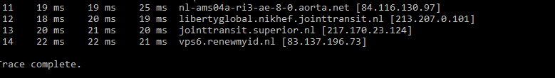 ik zal hieronder wat Ping en trace routes plaatsen., zoals gevraagd door ziggo. Ik kan overigens wel gewoon naar google.nl en naar ziggo.nl onder WiFi van ziggo.