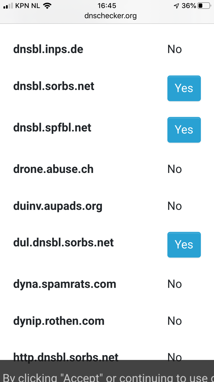 zag overigens wel dat ons ip adres geblocklist staat bij 3 servers. Geen idee hoe en waarom dat is? Het gaat om de volgende servers: