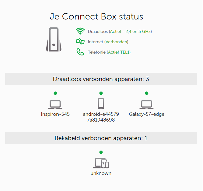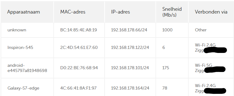 Ik heb even een laptop via wifi aangesloten. Als ik die weer uitzet staat hij ook bij de bekabeld aangesloten apparaten. Zet ik hem daarna weer aan, dan wordt hij dubbel vermeld, dus zowel bekabeld als via wifi.
