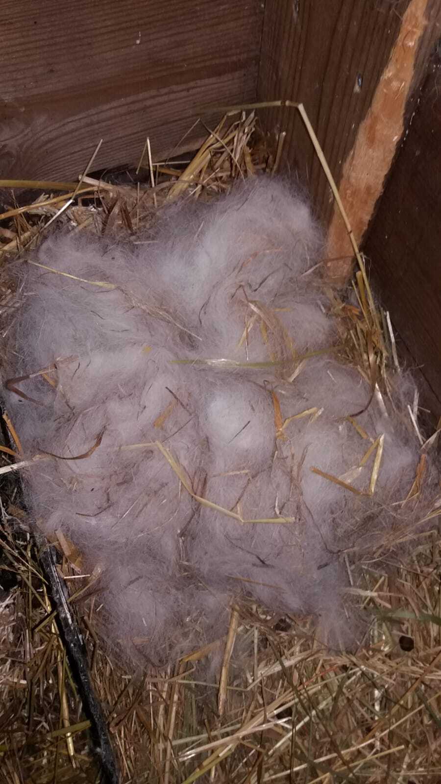 Kwart over elf 's avonds: had onze Medusa eerder het nestje wat open gelegd voor de warmte, heeft ze nu een flinke hoeveelheid extra haar uit haar vacht getrokken om de kleintjes toe te dekken tegen de kou. De natuur is toch wonderlijk. Zelfs de ukkies doen moeite om het haar weg te krijgen of over zich heen te trekken. Dat is werkelijk een schitterend schouwspel.