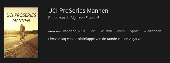 Het is niet direct een fout in de EPG. Maar ik zag zo geen betere plek of een EPG gerelateerde topic. Op Eurosport worden wedstrijden in de EPG allemaal "UCI Pro Series Mannen" genoemd, Of "UCI WorldTour Mannen" (er is ook een vrouwen variant). Als er meerdere wedstrijden uit de Pro Series worden uitgezonden krijg je een hele kudde "Pro serie"' in de EPG. Maar sowieso, waarom gewoon niet de naam van de koers vermelden? Ruta del Sol, Ronde van Algarve, UAE Tour etc.? Bij GTST staat er ook niet alleen maar "soap"...