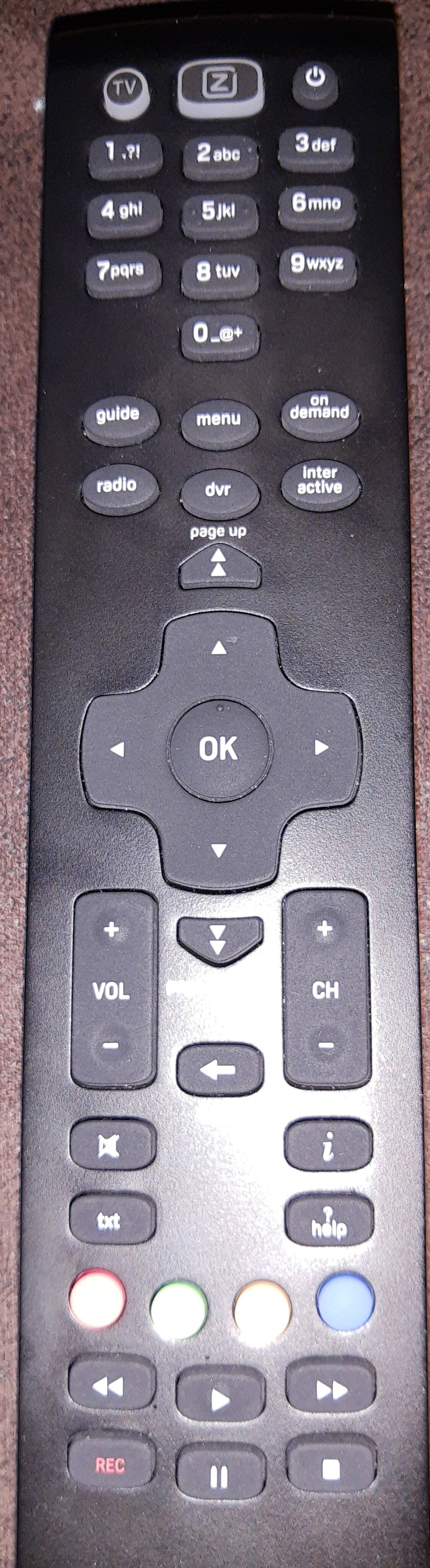 Op deze PACE- mediabox afstandsbediening zit inderdaad geen source knop aan de voorkant.