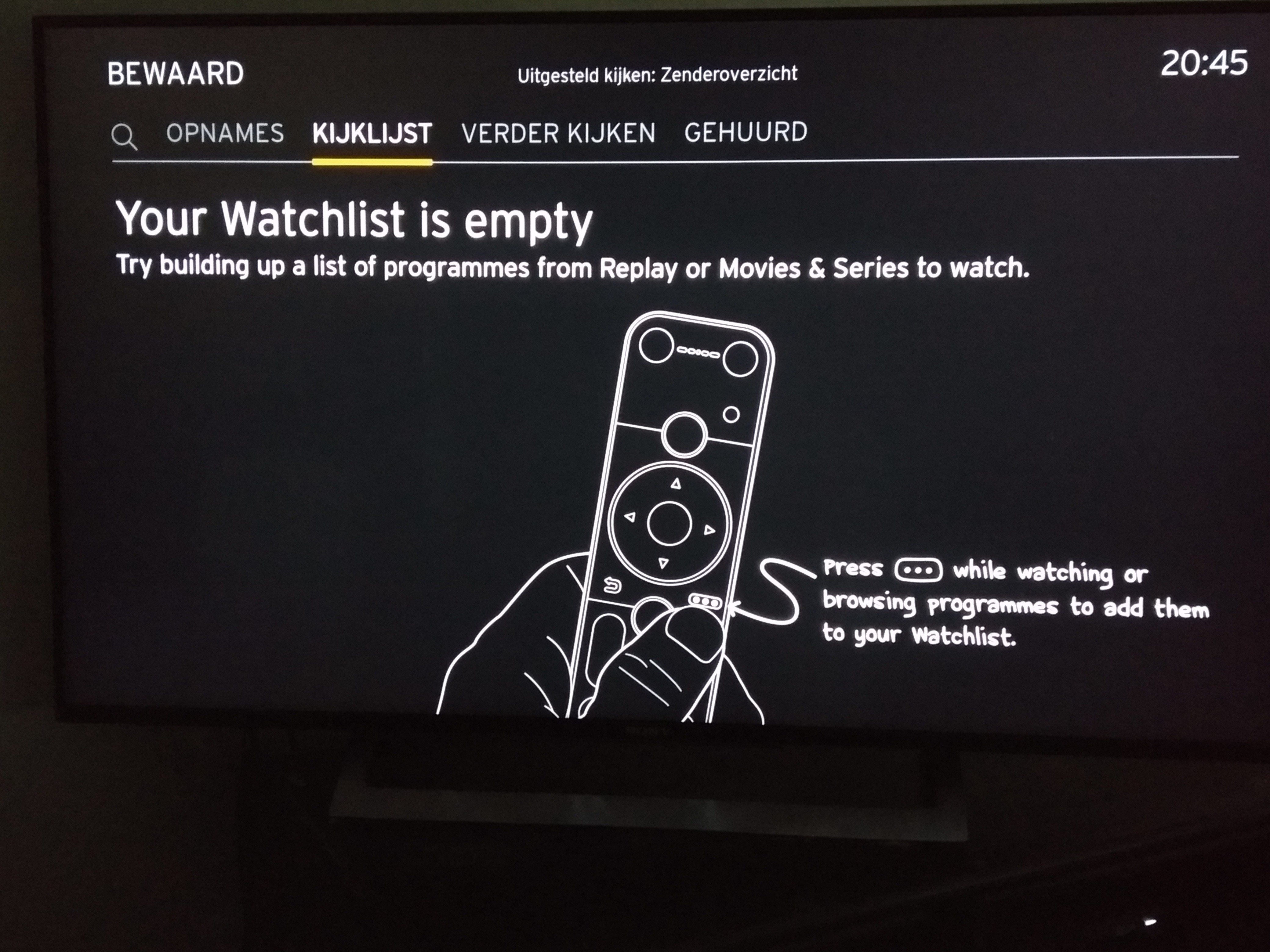 Tekst 'Lege kijklijst' is hier ook in het Engels. Goede kans dat dit met update 4.17 over het hoofd is gezien. Een andere adviestekst (tip om huisje te gebruiken in TV Gids) was gewoon in het Nederlands. Dat kan dus wel een of twee maanden duren. Ik hoop wel dat ik er flink naast zit en dat Dave- gelijk heeft.